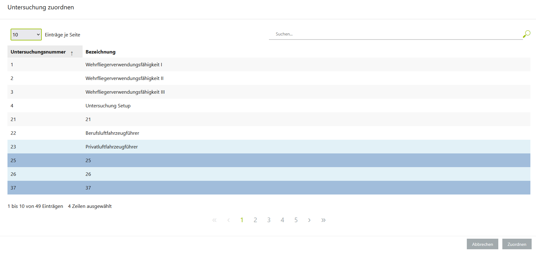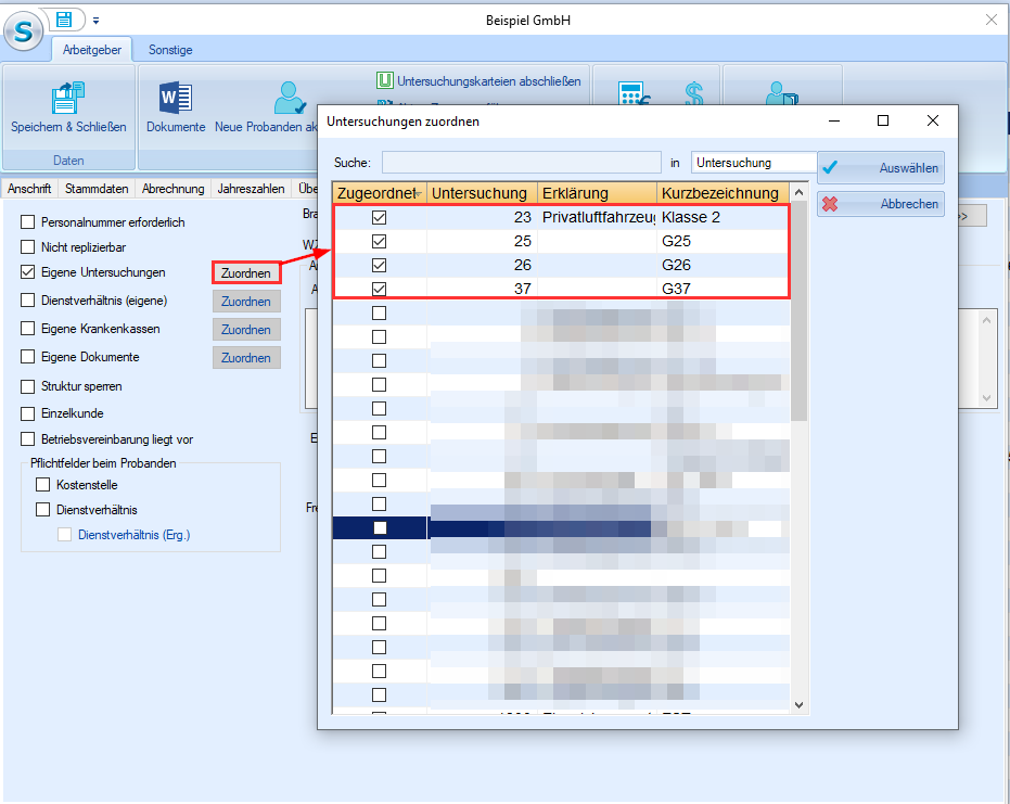 Hier können Sie Untersuchungen auswählen, welche Sie dem Arbeitgeber zuweisen möchten. Auch eine Mehrfachauswahl ist möglich: