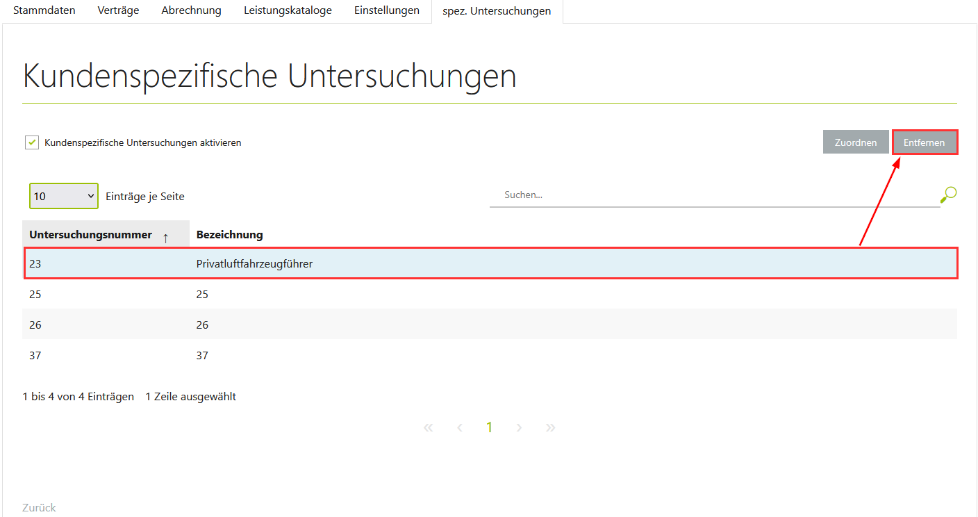 Wenn Sie in diese Übersicht nun eine oder mehrere Untersuchungen anwählen, so wird die Schaltfläche Entfernen aktiv.