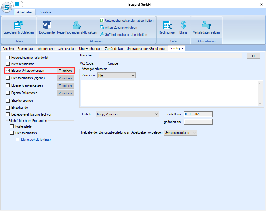 Durch die Aktivierung der Einstellung Kundenspezifische Untersuchungen aktivieren in sOne Web, wird auch dies in SAmAs so hinterlegt. Die Eigenen Untersuchungen wurden aktiviert: