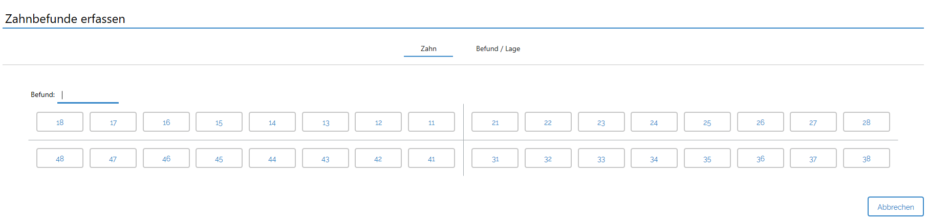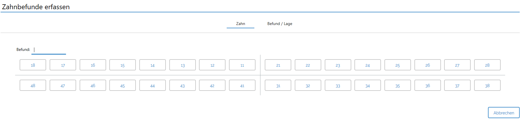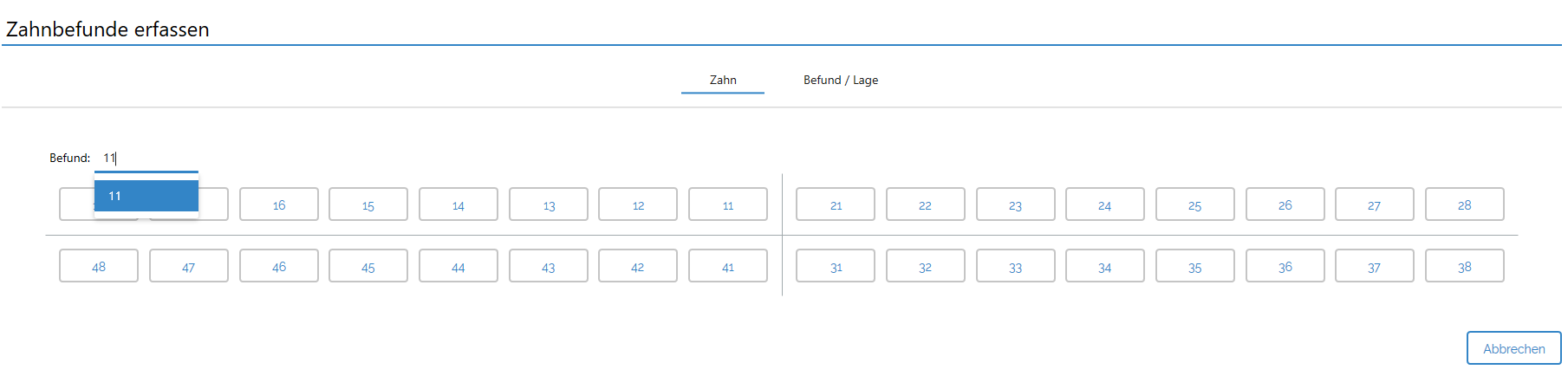 Durch Eingabe des Zahns und Klick auf Enter wird automatisch in den Reiter Befund/Lage navigiert: