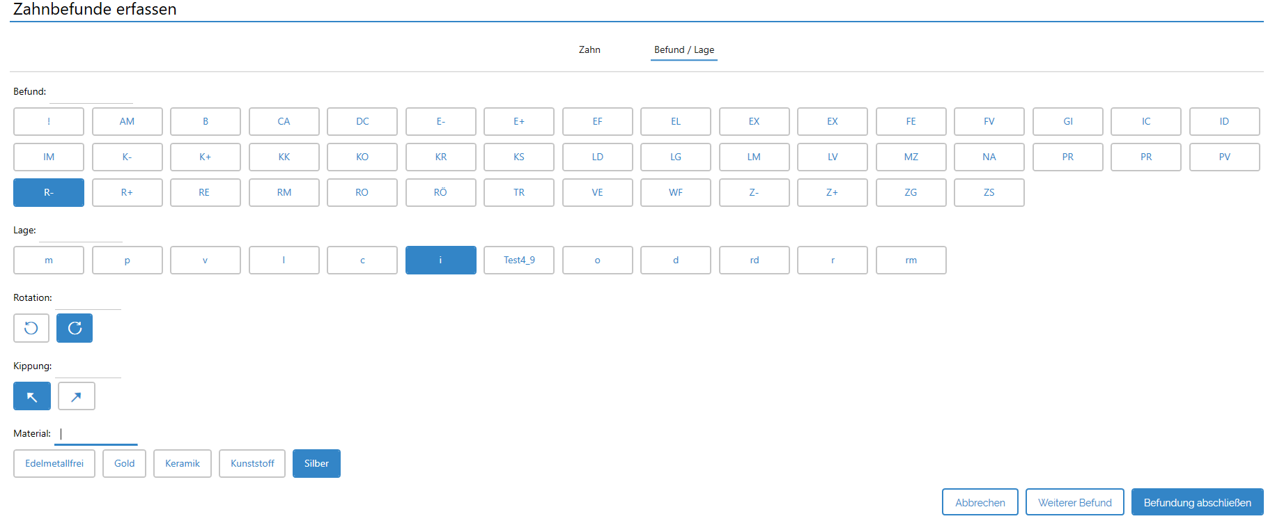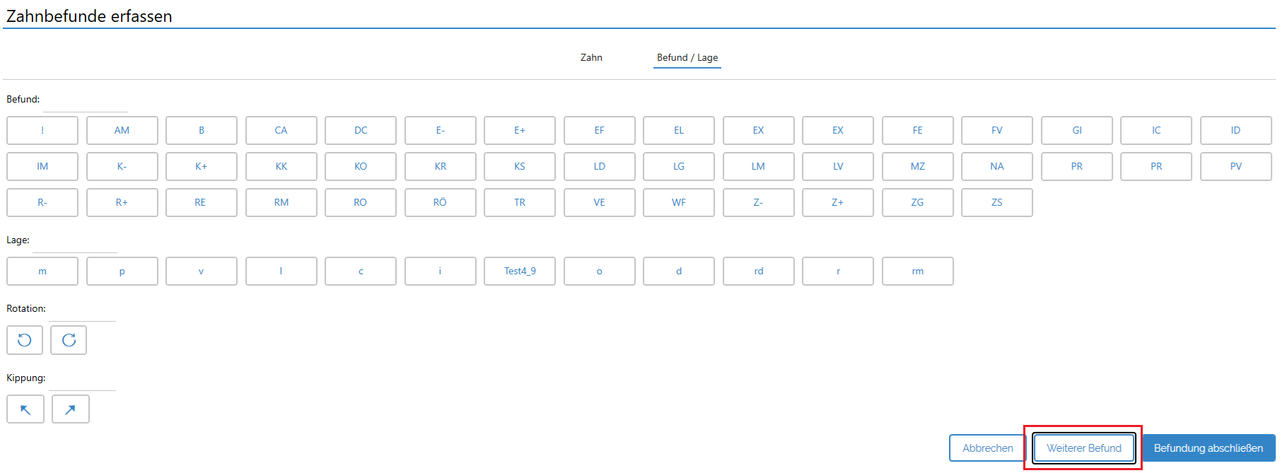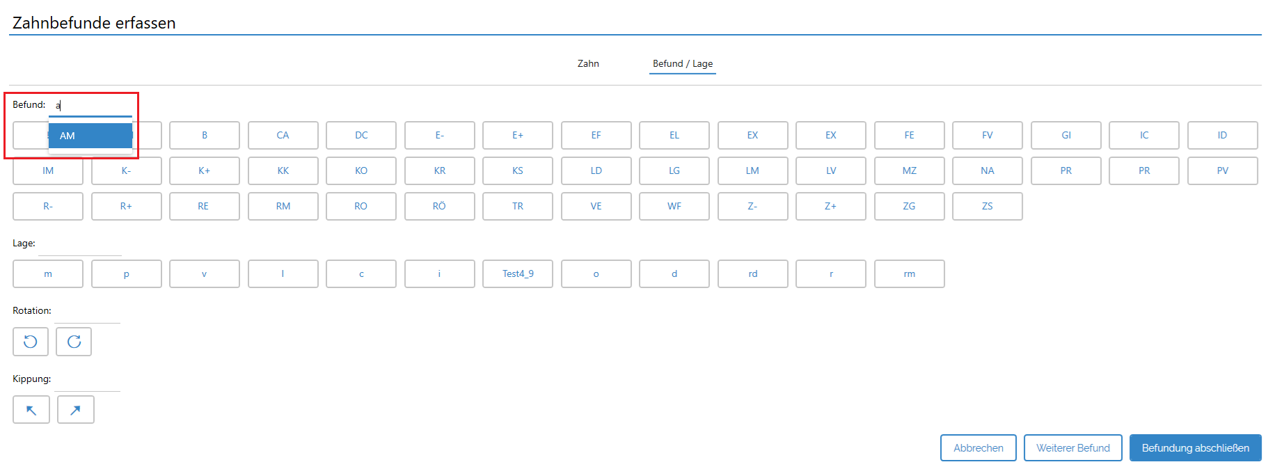 Mit der Tab-Taste kann zwischen den Feldern Befund, Lage, Rotation und Kippung und sowie der Schaltflächen Abbrechen, Weiterer Befund und Befundung abschließen hin und her navigiert werden.