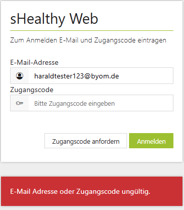 - Der Proband fordert auf der Loginseite von sHealthy erneut einen Zugangscode an. Er erhält eine E-Mail mit dem entsprechenden Code.