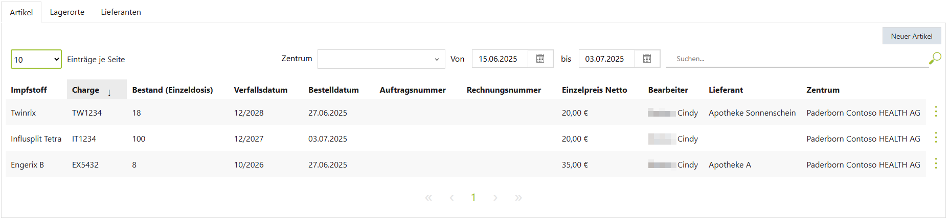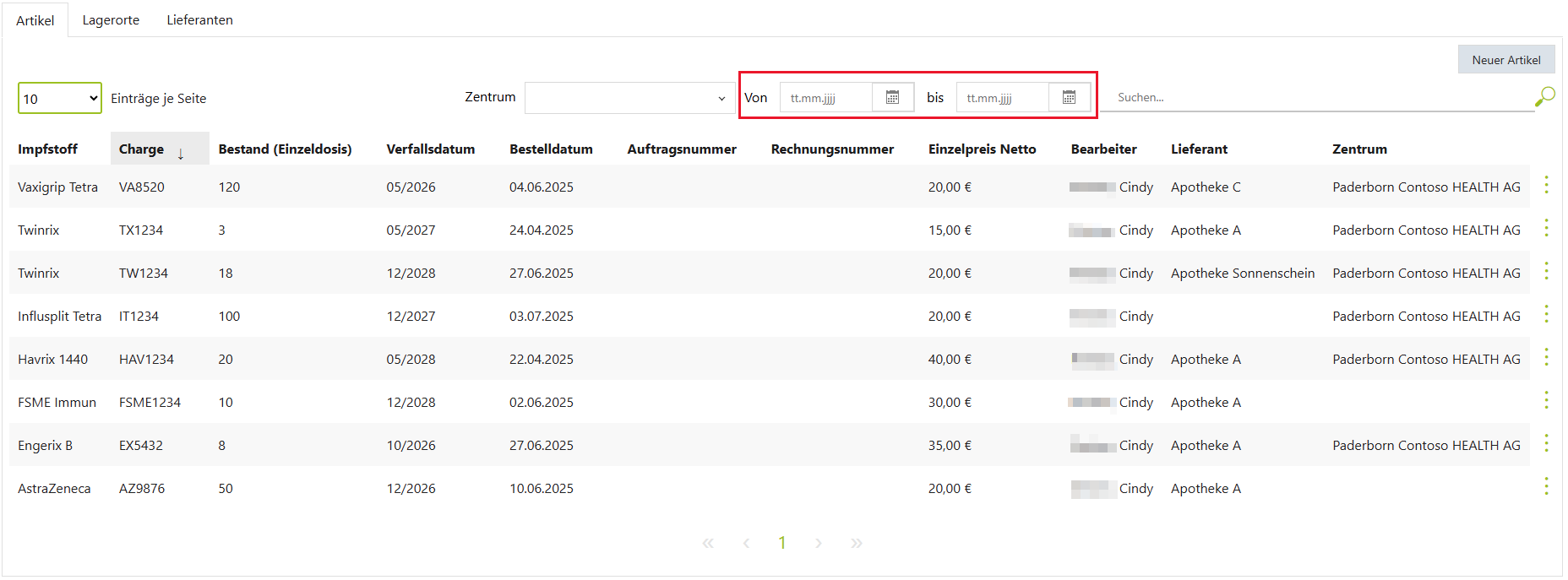 Beim Öffnen der Artikelliste bleibt die Zeitraumfilterung nun leer und es werden alle vorhandenen Impfstoffe ausgegeben: