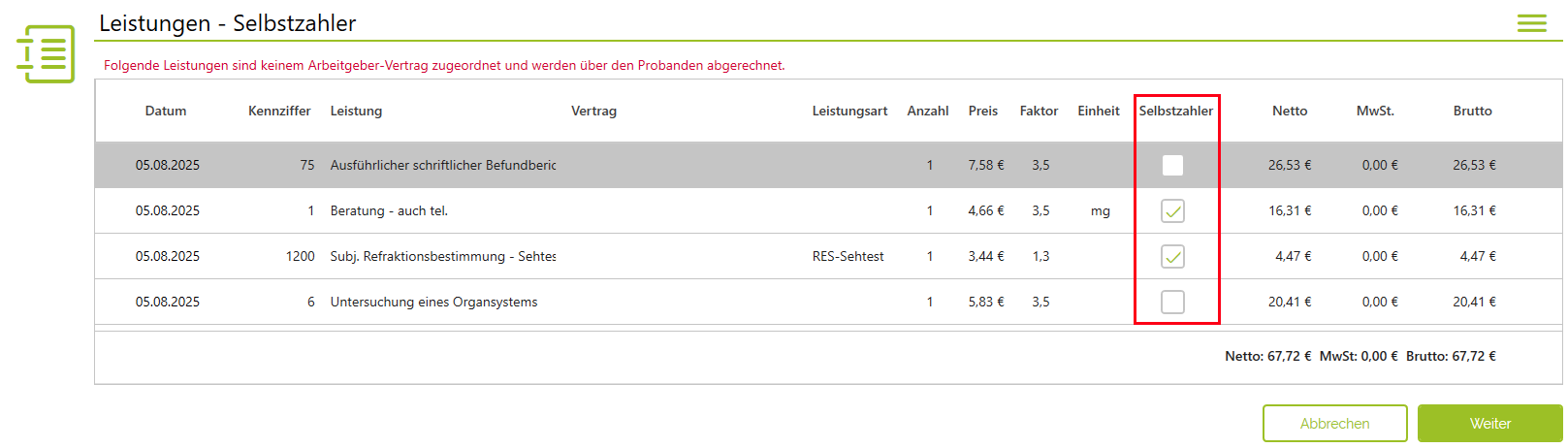 Es erscheint beim Selbstzahler-Fenster der Hinweis, dass bestimmte Leistungen keinem Arbeitgeber-Vertrag zugeordnet sind und somit über den Probanden abgerechnet werden: