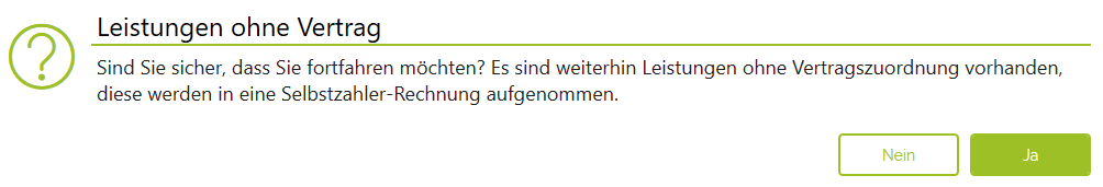 Wenn Sie dies mit Weiter bestätigen, erscheint dann eine weitere Meldung, dass Leistungen ohne Vertragszuordnung vorhanden sind: