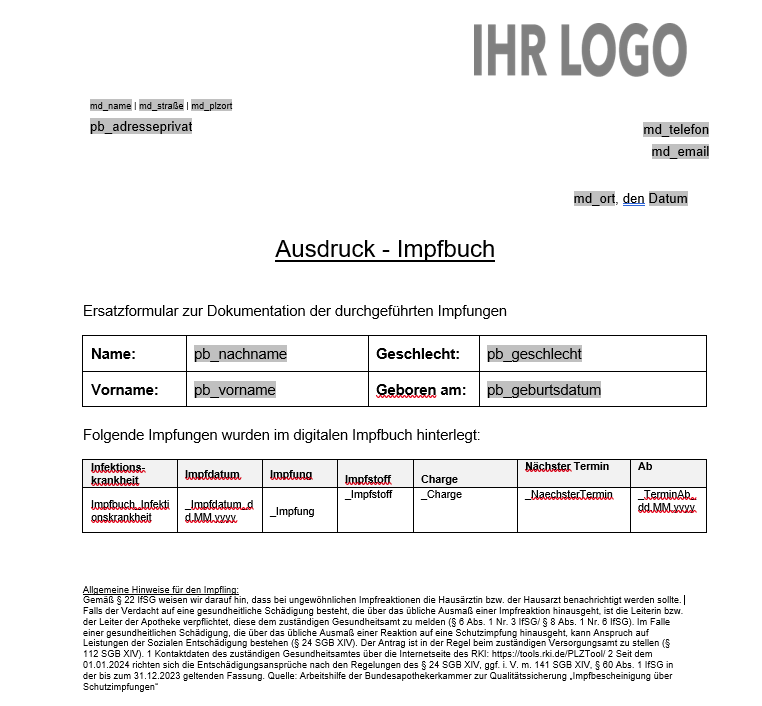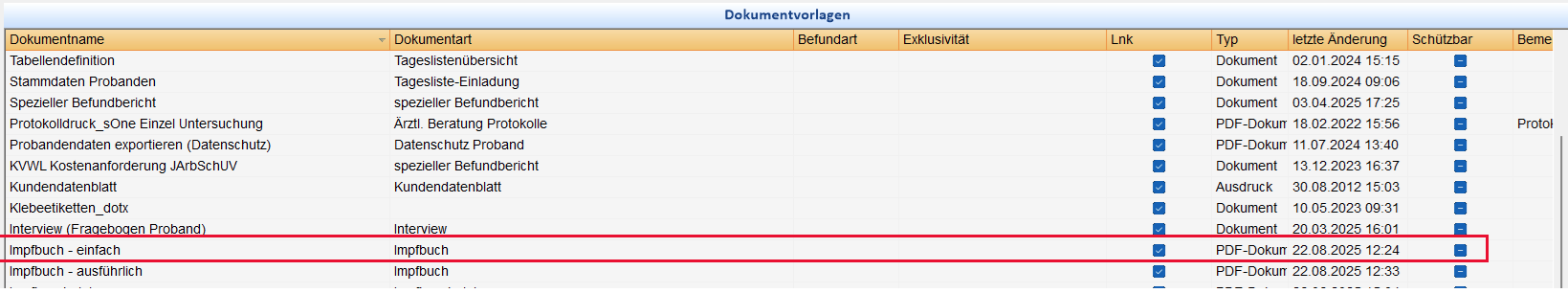 In SAmAs wurde eine Dokumentenvorlage für das Impfbuch (Dokumentart Impfbuch, Typ PDF-Dokument) hinterlegt: