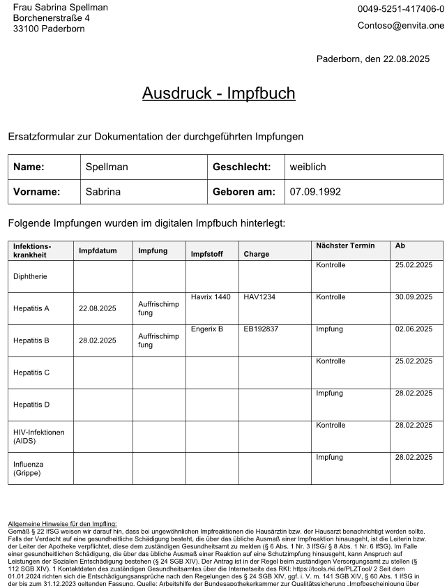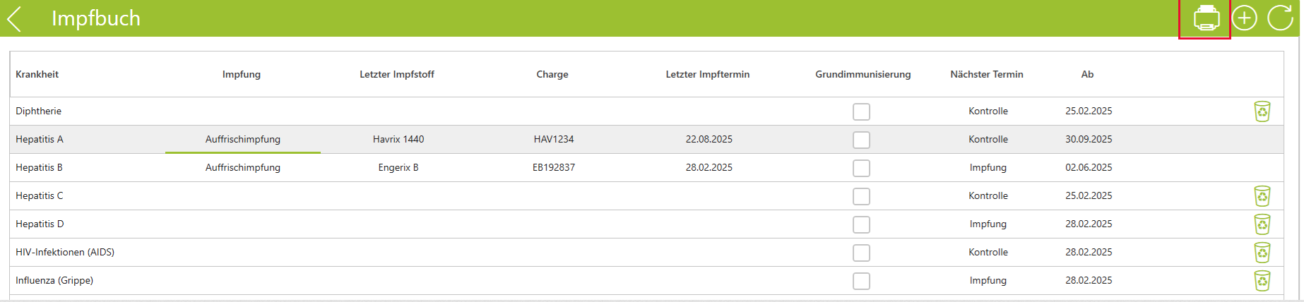 Über die jetzt gezeigte Ansicht kann man das Impfbuch jetzt ausdrucken oder abspeichern.