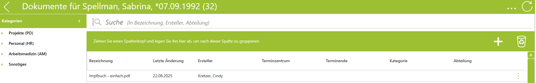 Beim Klick auf Ja wird das Dokument unter Dokumente bei dem Probanden hinterlegt: