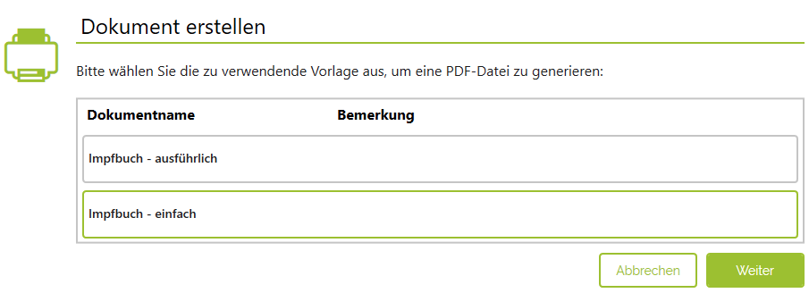 Hinweis: Das Fenster wird nur angezeigt, wenn mehr als eine Dokumentvorlage für das Impfbuch vorhanden ist. Anderenfalls wird dies übersprungen und direkt das Dokument erstellt.