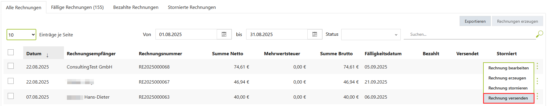 Im Bereich der Rechnungen finden Sie im seitlichen Kontextmenü jetzt einen neuen Eintrag Rechnung versenden.