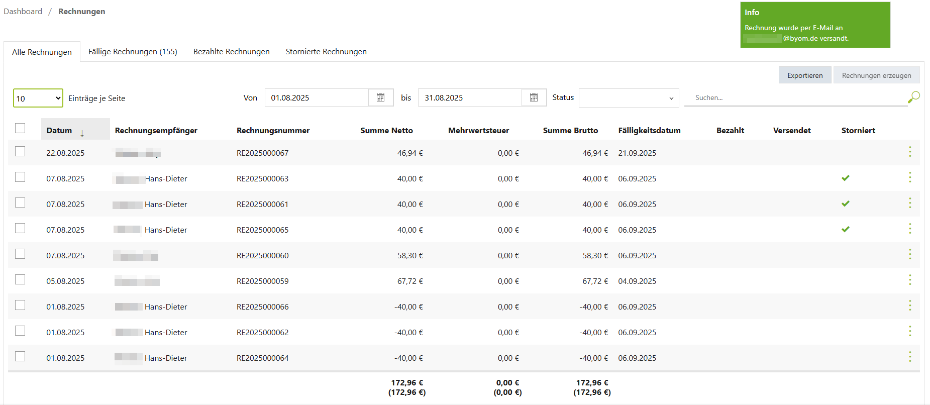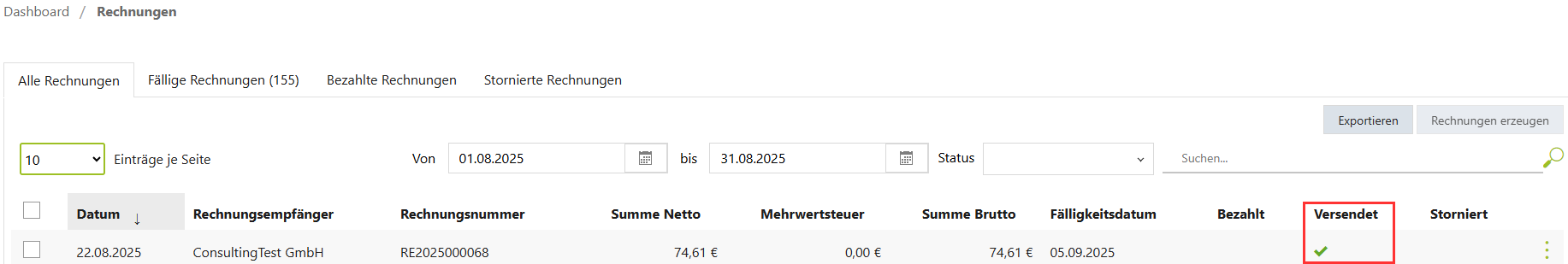 Wurde die Rechnung erfolgreich versendet, so wird dies mit einem