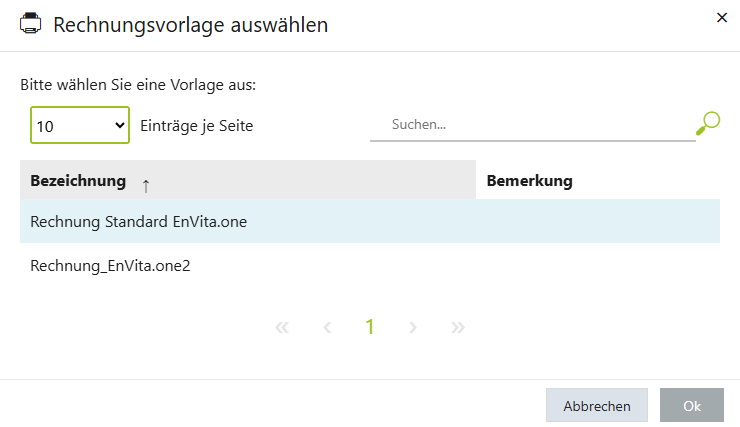 Sobald Sie jedoch mehr Rechnungsvorlagen haben, erscheint bei Klick auf die Schaltfläche Rechnung versenden das Fenster Rechnungsvorlage auswählen. Hier wählen Sie dann die gewünschte Vorlage aus und Klicken anschließend auf OK. Die Rechnung wird dann versendet.