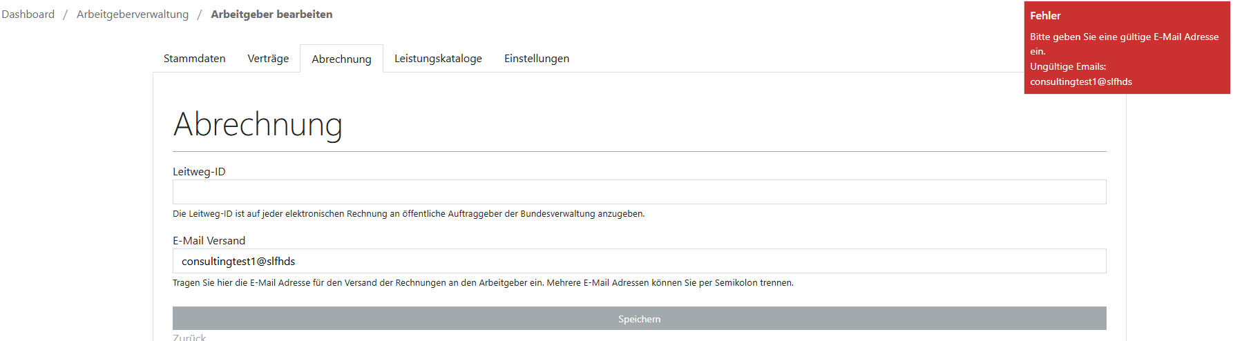 Wurde keine gültige E-Mailadresse hinterlegt, erscheint oben rechts in rot eine Meldung, dass die E-Mailadresse ungültig ist: