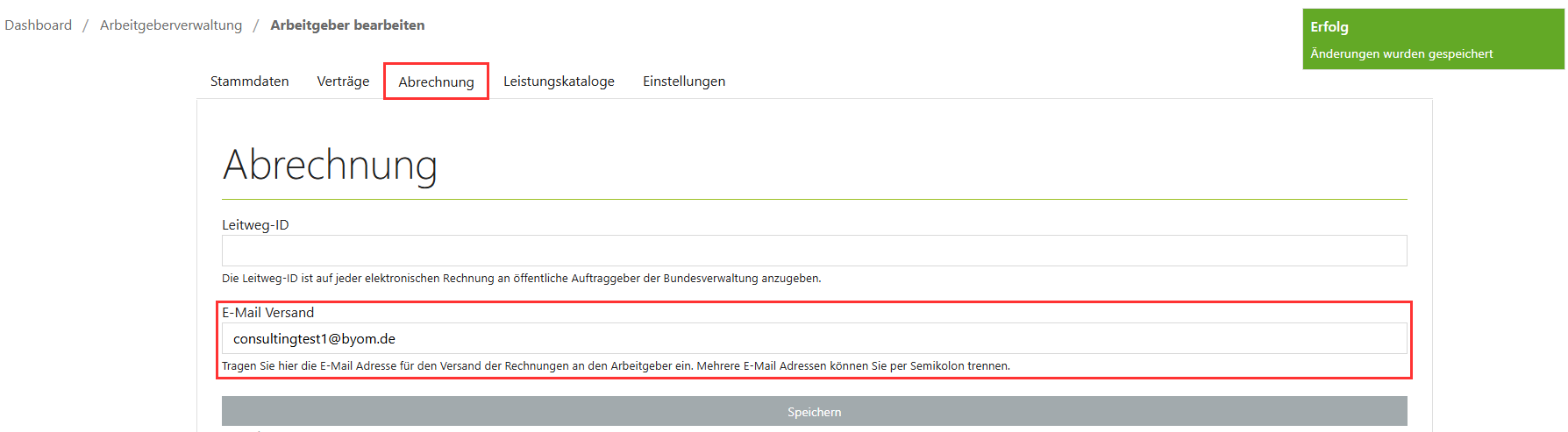 Um eine Rechnung per E-Mail versenden zu können, muss beim Arbeitgeber auch eine E-Mailadresse für den Rechnungsversand hinterlegt werden.