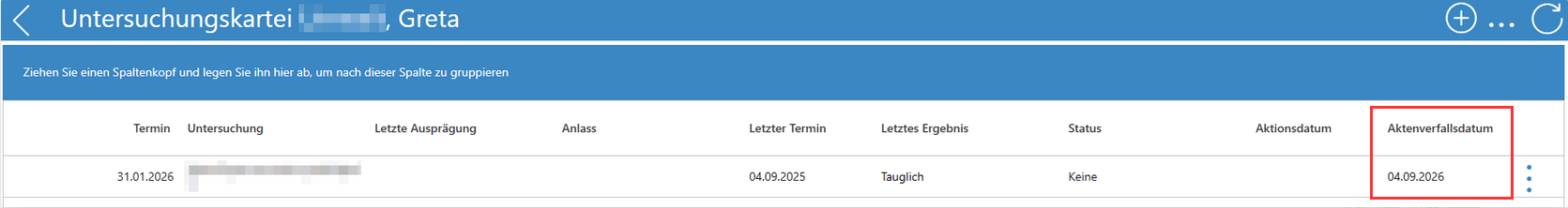 Die Untersuchungskartei des Probanden wurde um eine neue Spalte mit der Bezeichnung Aktenverfallsdatum erweitert: