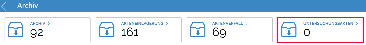 Wenn Sie auf dem Dashboard die Kachel Archiv öffnen, gelangen Sie zu nachfolgender Auswahl. Hier wurde der EIntrag Untersuchungsakten neu aufgenommen: