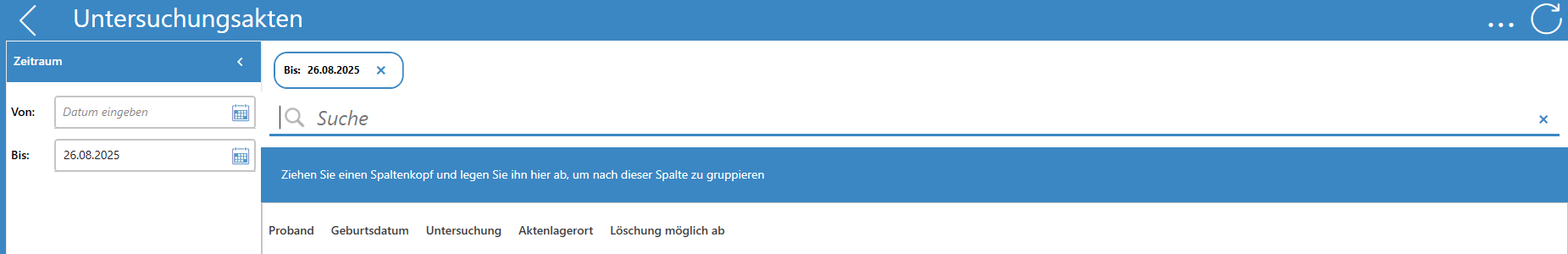 Beim Klick auf Untersuchungsakten öffnet sich nachfolgende Ansicht mit folgenden Spalten: