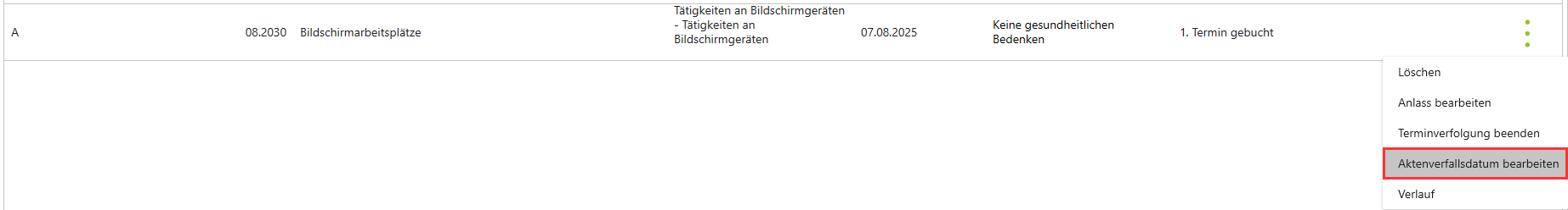 Ist diese Benutzerberechtigung auf zulassen gestellt, erscheint bei der Untersuchung (in der Untersuchungskartei)  im Kontextmenü der neue Eintrag Aktenverfalldatum bearbeiten.