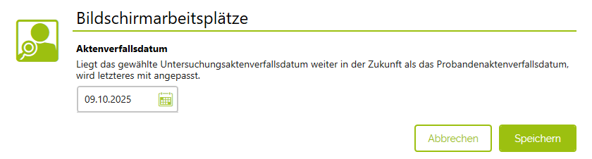 Wählen Sie den Eintrag Aktenverfalldatum bearbeiten an, so erscheint ein weiteres Fenster. Hier können Sie das Aktenverfallsdatum für diese Untersuchung verändern.