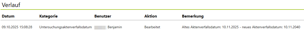 Im Verlauf wird die Änderung des Aktenverfallsdatums mit dokumentiert:
