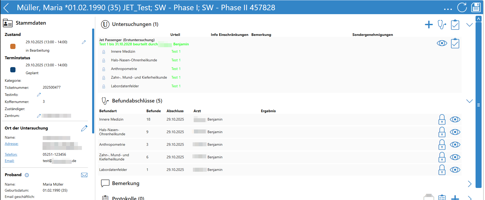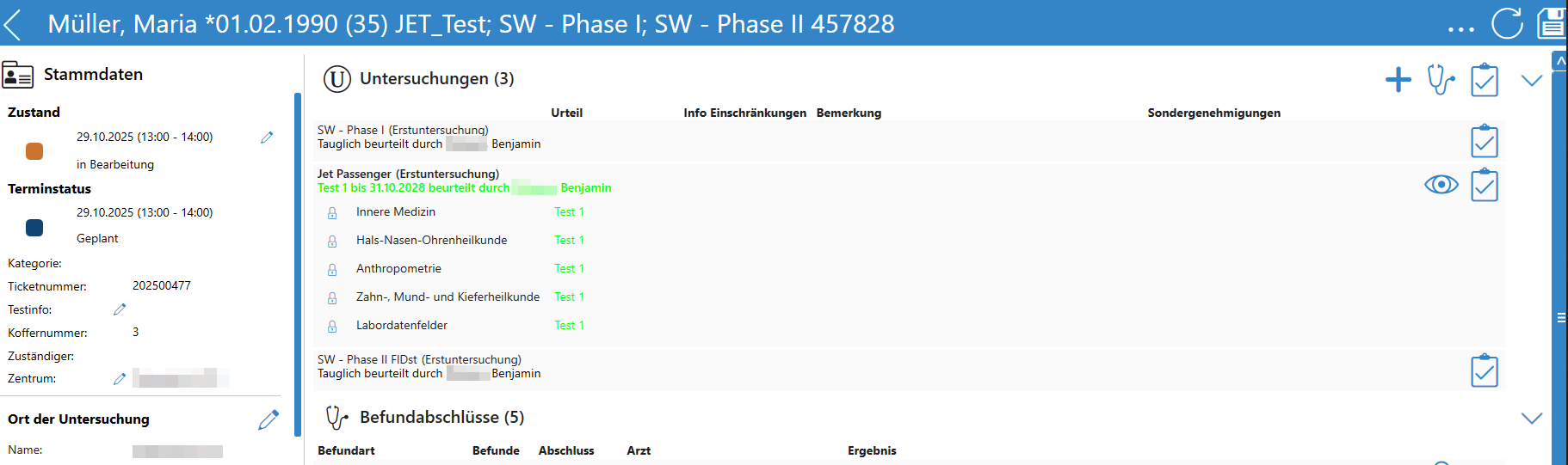 Es wurde ein Termin erstellt, in welchem drei Untersuchungen enthalten sind. Zwei davon sind einer Eigenschaften-Vererbungsgruppe zugeordnet, eine davon ist ohne Eigenschaften-Vererbungsgruppe.