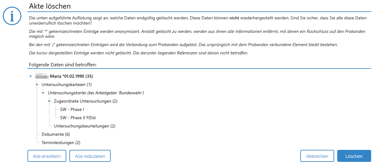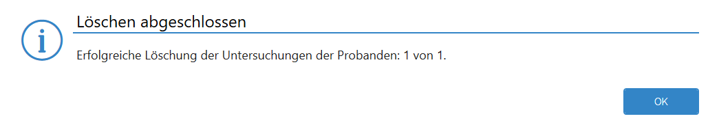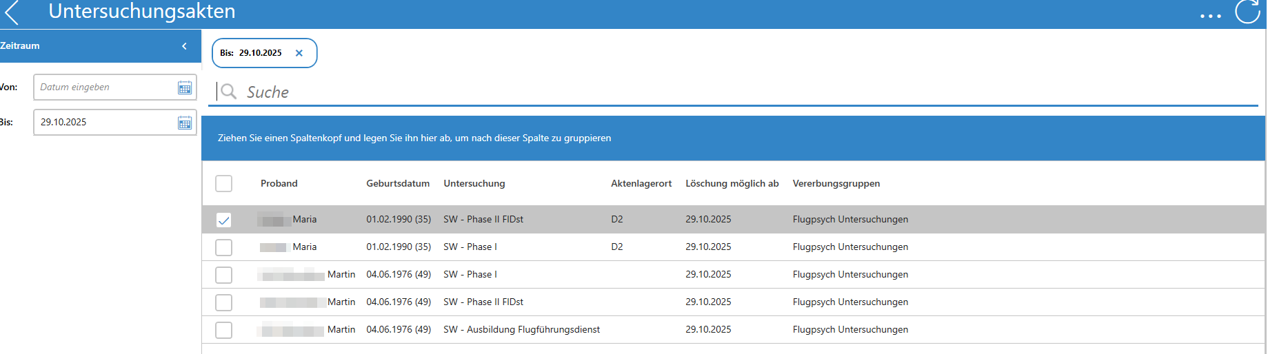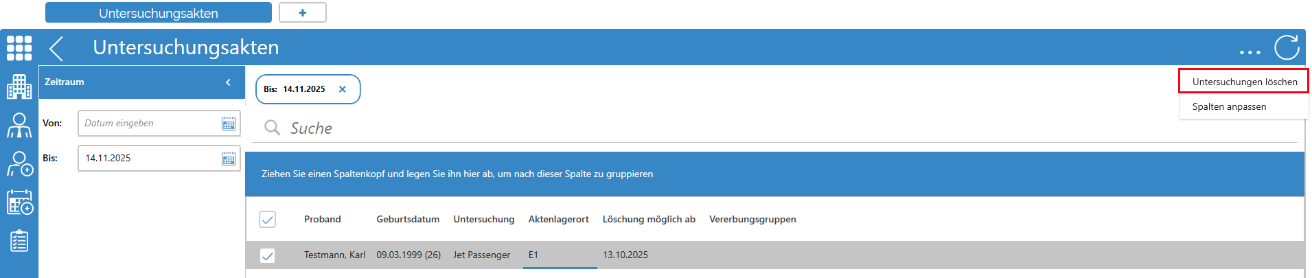 Wenn jetzt über die Kachel Archiv -> Untersuchungsakten der betroffene Proband markiert wird (über die Checkbox am Anfang) und über das Kontextmenü Untersuchungen löschen gewählt wird, so sollen nur die Untersuchungen gelöscht werden, die zu der Eigenschaften-Vererbungsgruppe gehören.