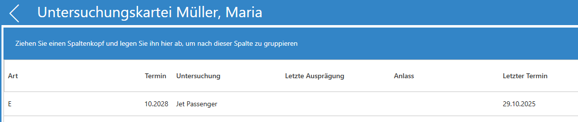 Nach Klick auf Untersuchungen löschen, öffnet sich nachfolgendes Fenster. Es wurden beide in der Gruppe konfigurierten Untersuchungen und der angelegte Termin gefunden: