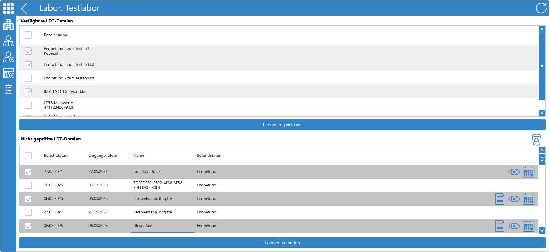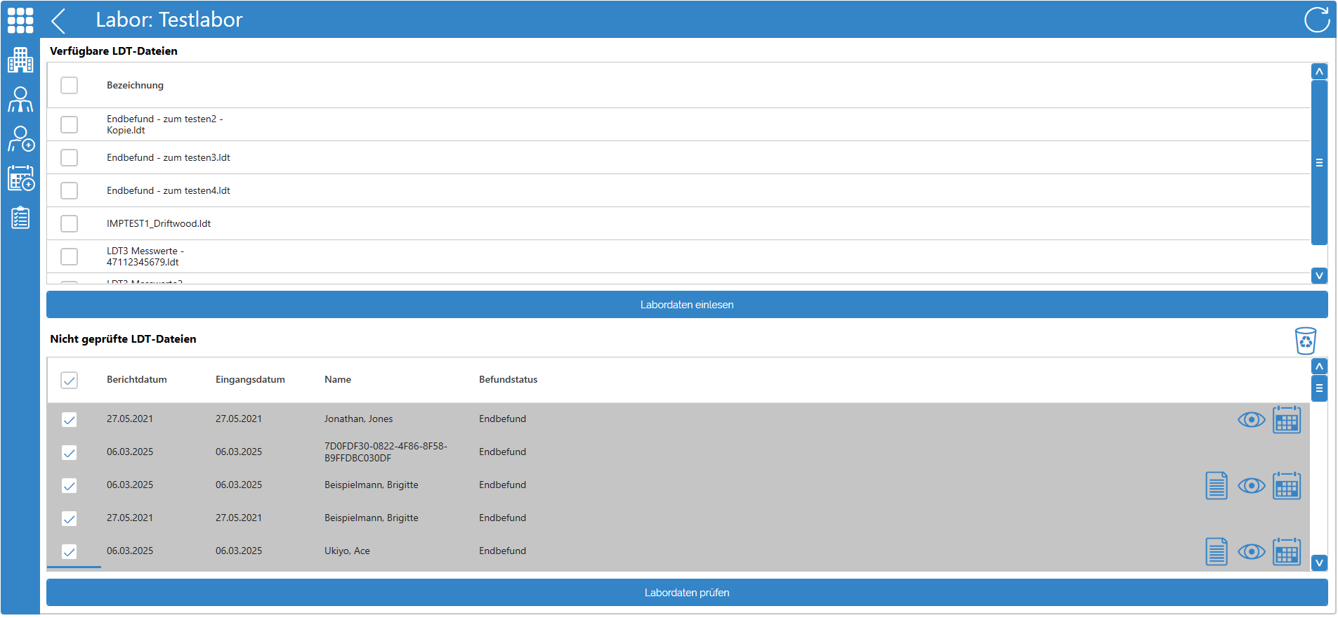 Die LDT-Dateien werden erfolgreich eingelesen und aus dem Bereich Verfügbare LDT-Dateien entfernt. Die ausgelesenen Einträge werden jetzt im Bereich Nicht geprüfte LDT-Dateien aufgelistet.