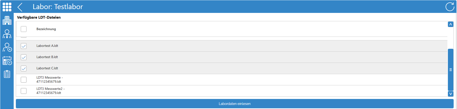 Sie können hier wie bereits zuvor beschrieben mehrere Einträge auswählen und dann die Schaltfläche Labordaten einlesen betätigen.