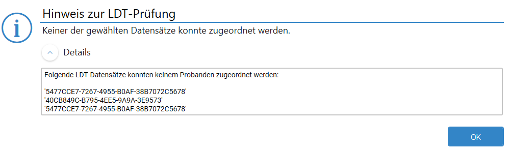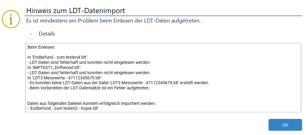 Konnte eine LDT-Datei nicht erfolgreich eingelesen werden, so erscheint eine Hinweismeldung. Im unteren Beispiel wird gezeigt, um welche LDT-Dateien es sich handelt: