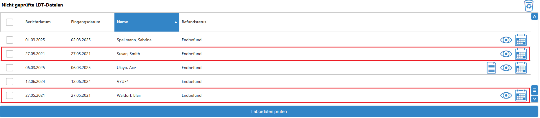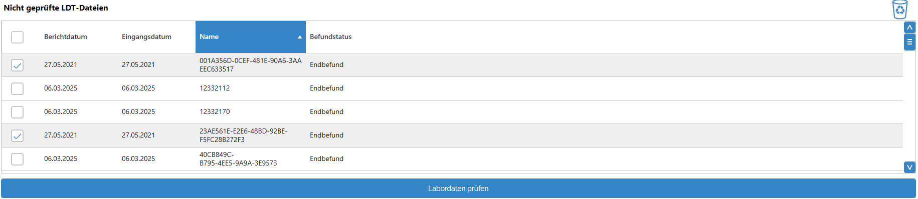 Die ausgelesenen Laboraufträge können markiert (auch Mehrfachauswahl über die Checkboxen möglich) und anschließend über die Funktion Labordaten prüfen kontrolliert werden.