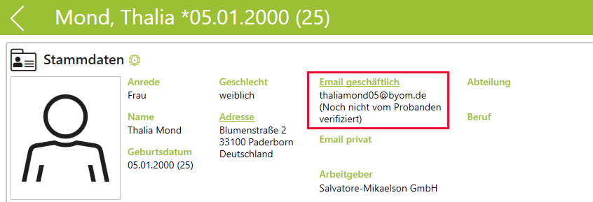 "Noch nicht verifiziert" wird bei der E-Mail-Adresse des Probanden entfernt: