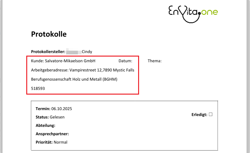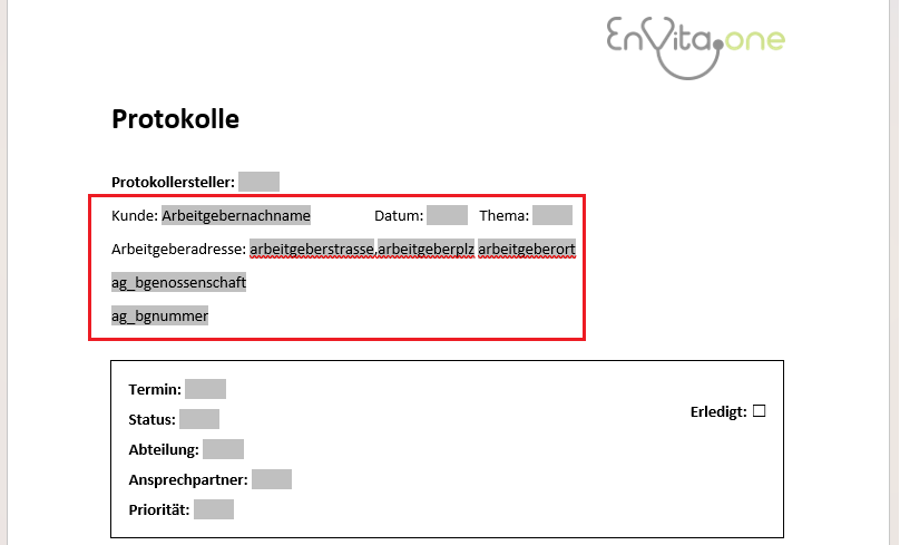 Wenn ein Arbeitgeber im Termin angegeben ist und ein Protokoll erstellt wird, werden die Textmarken automatisch mit den entsprechenden Daten befüllt: