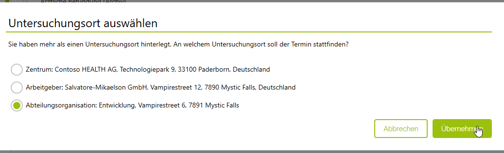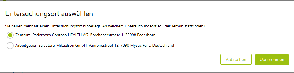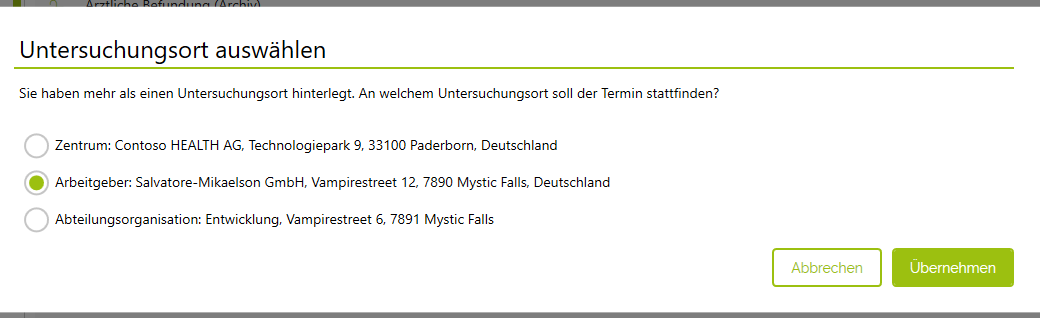 Über das Stift-Symbol kann der Untersuchungsort geändert werden. Es öffnet sich neues Fenster, in dem die zur Verfügung stehenden Untersuchungsorte ausgewählt werden können. Der zuvor hinterlegte Untersuchungsort wird automatisch vorausgewählt. In diesem Beispiel ist dies der Arbeitgeber: