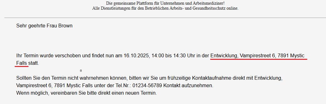 Nach der Übernahme der Änderung erhält der Proband automatisch eine Terminänderungs-E-Mail mit dem neuen Untersuchungsort: