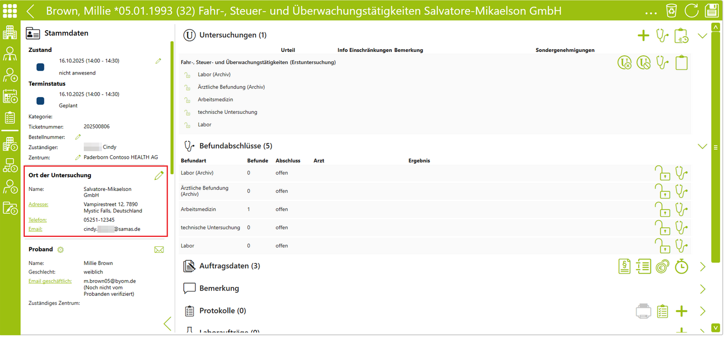 Auf der linken Seite des Termins wird der Bereich "Ort der Untersuchung" angezeigt. Dieser zeigt den Untersuchungsort an, der beim Anlegen des Termins ausgewählt wurde: