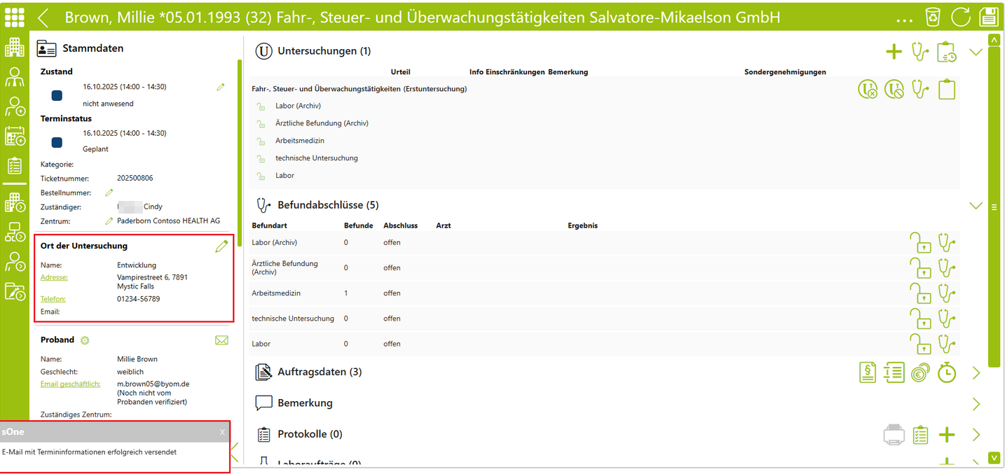 Der Untersuchungsort wird im Untersuchungstermin angezeigt und kann geändert werden.