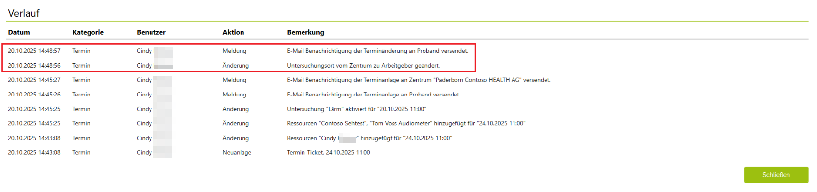 Die Änderungen der Untersuchungsorte werden im Verlauf gespeichert (siehe Bild).