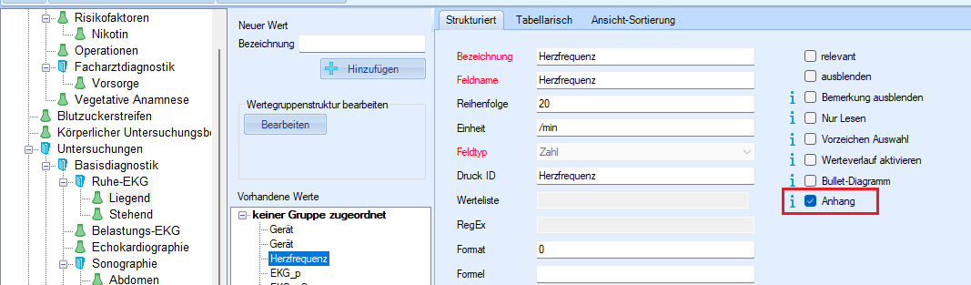 Die entsprechende Einstellung wurde in SAmAs Enterprise aktiviert. Navigieren Sie dazu zu Daten -> Standardtabellen -> Befunde ->Laborwerte und aktivieren Sie beim jeweiligen Laborwert die Option "Anhang".