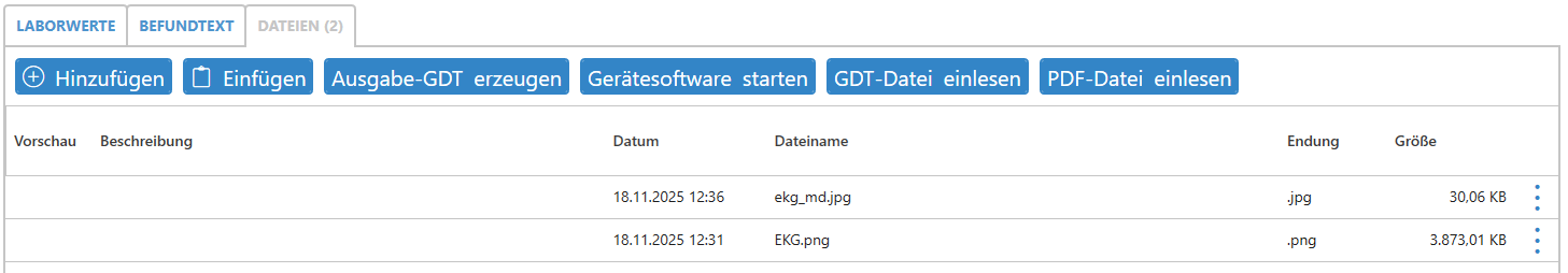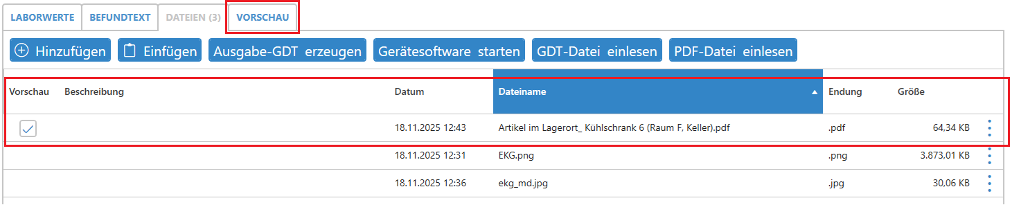 Hinweis: Für Bilder, die direkt an einem Laborwert hinzugefügt wurden, ist die Vorschau im Dateien-Reiter deaktiviert. Werden Dokumente direkt im Dateien-Reiter hinzugefügt, ist die Vorschau wie gewohnt aktiv.