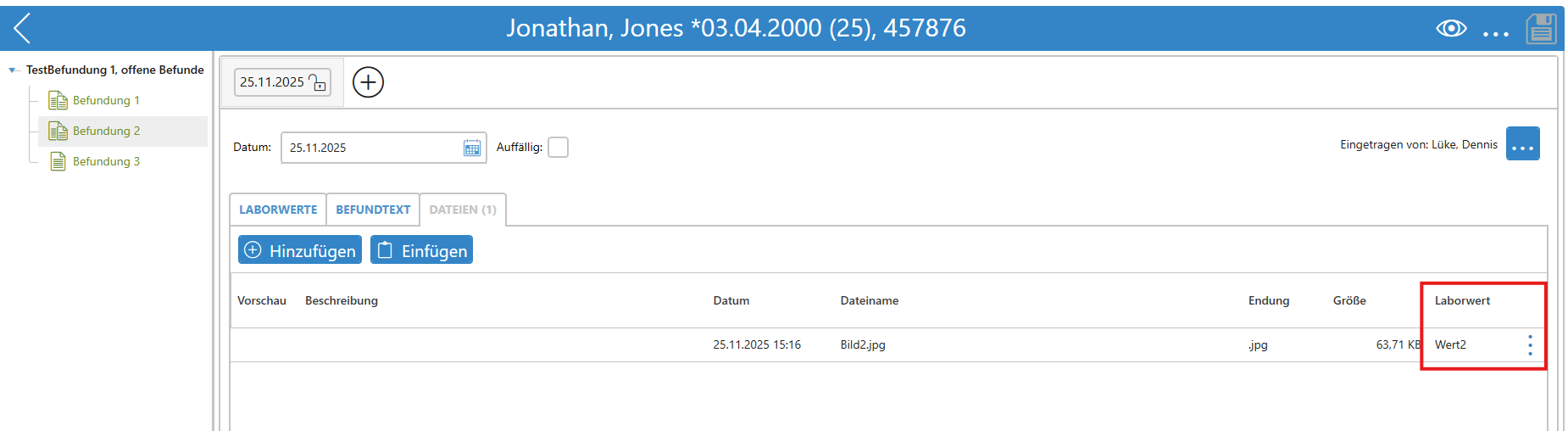Ist ein Bild an einen Laborwert gebunden, erscheint im Dateien-Reiter die Spalte "Laborwert" mit der korrekten Zuordnung.