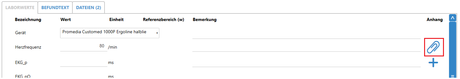 Bei Laborwerten mit aktivierter Einstellung sehen Sie ein "+", über das Sie einen Anhang hinzufügen können.