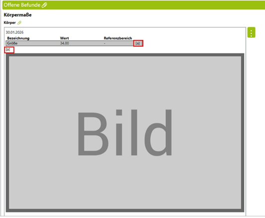 Mit dieser Funktion können Sie Bilder direkt an Laborwerten hinterlegen oder wieder entfernen. Die hinzugefügten Bilder werden in der Ansicht sowie im Befunddruck und Befundbericht angezeigt.