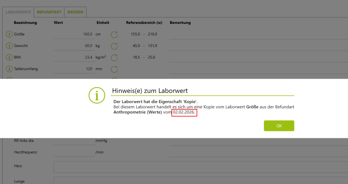 Die neue Funktion verbessert die Nachvollziehbarkeit von kopierten Laborwerten, indem das genaue Ursprungsdatum nun klar und konsistent ausgewiesen wird.