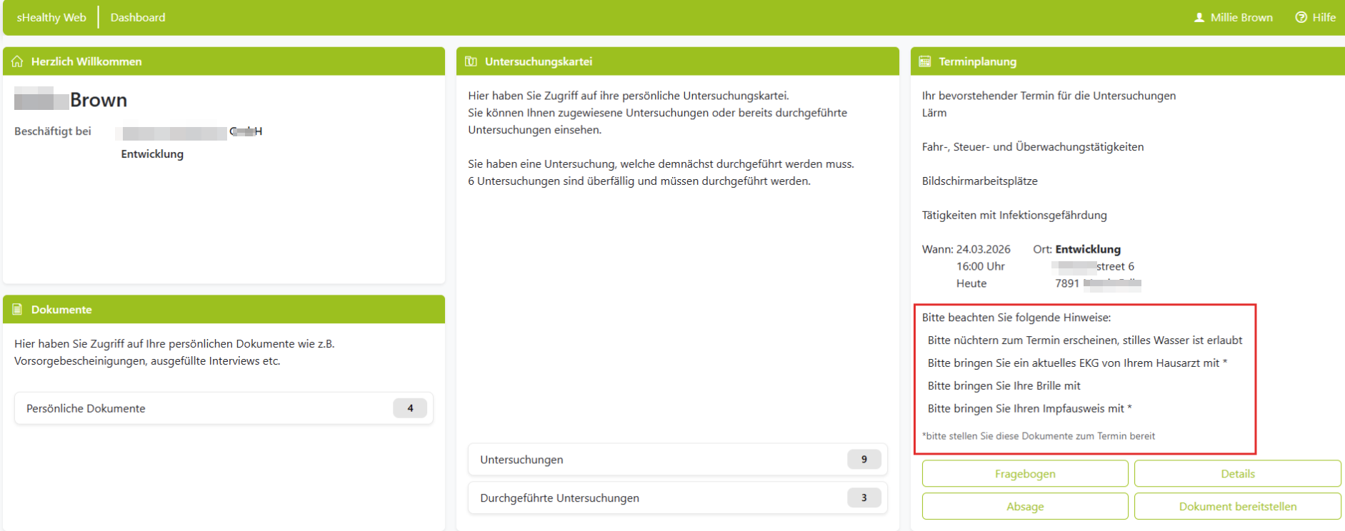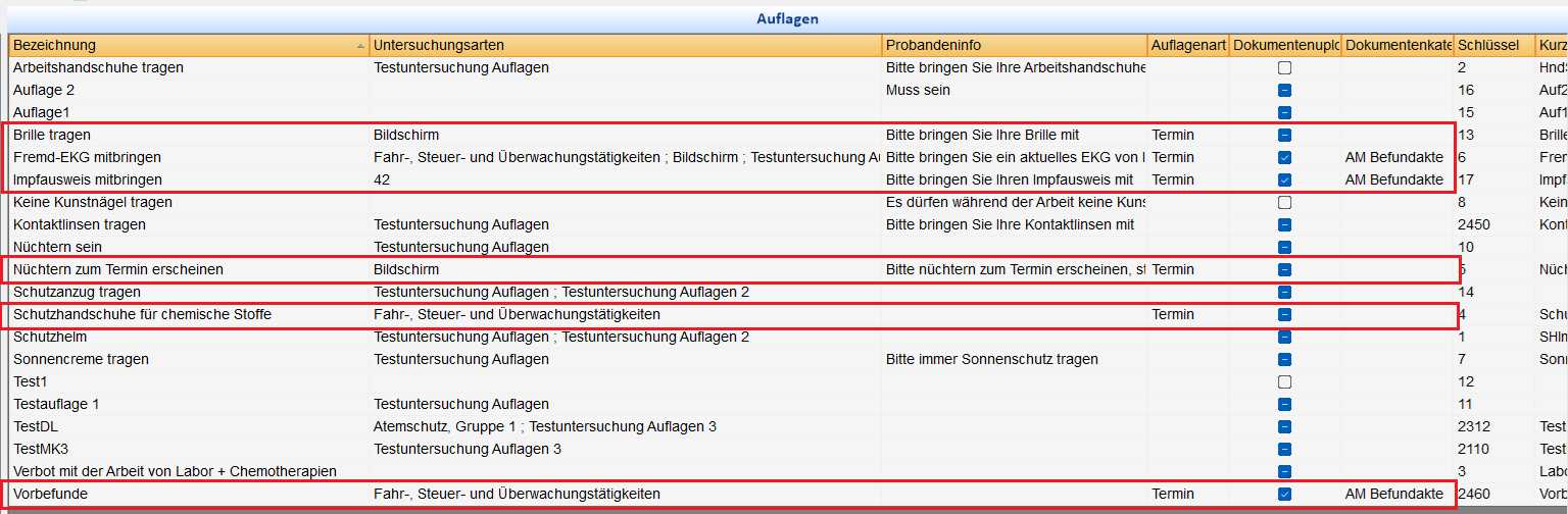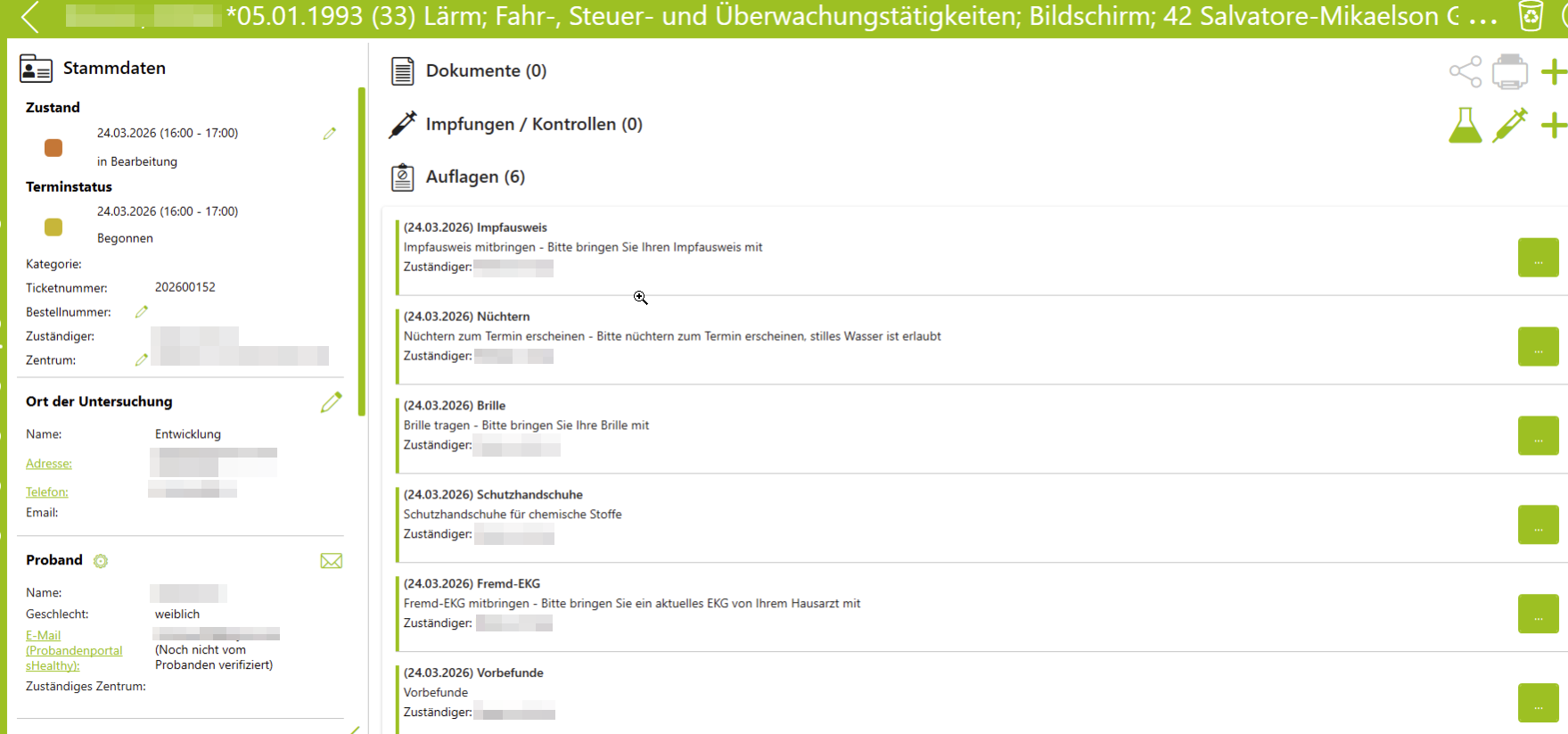 Nach dem Hinzufügen der Untersuchungen im Termin (z. B. Bildschirm, Fahr‑/Steuer‑/Überwachungstätigkeiten, Tätigkeiten mit Infektionsgefährdung) werden die konfigurierten Auflagen korrekt an den Probanden ausgegeben.