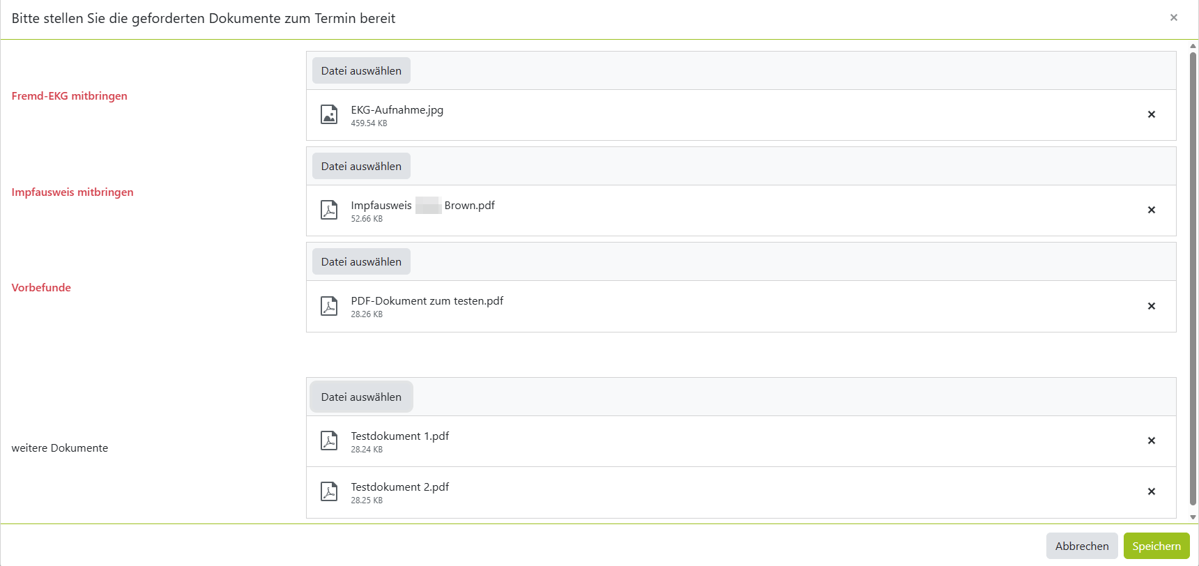 - Upload z. B. für Fremd‑EKG, Impfausweis und Vorbefunde