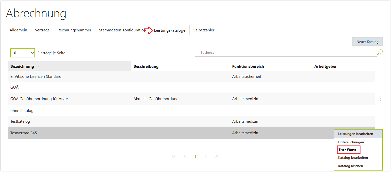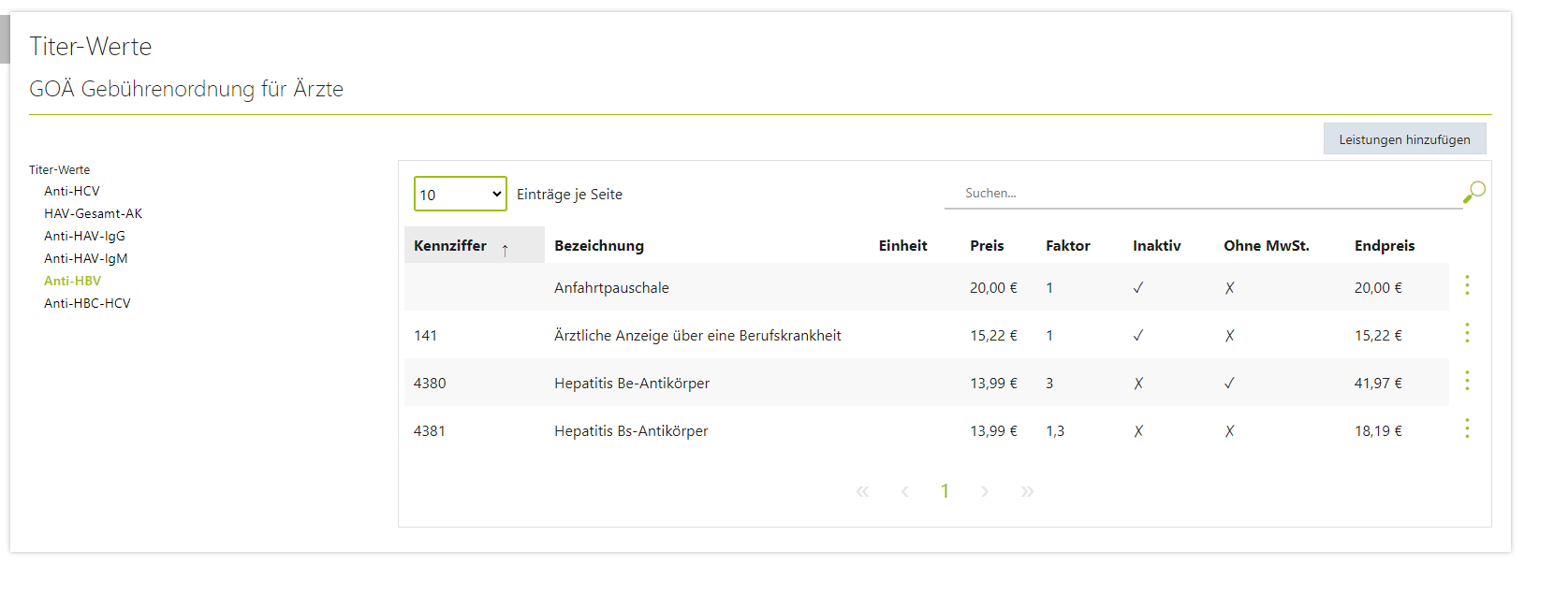 Der Leistungskatalog wurde um die neue Funktion „Titer‑Werte“ erweitert. Damit können Titer‑Werten jetzt direkt passende Leistungen aus dem Katalog zugeordnet werden. Die zugeordneten Leistungen werden übersichtlich in der Detailansicht des jeweiligen Titer‑Werts angezeigt.