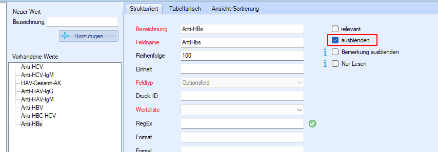 Zusätzlich werden ausgeblendete Titer‑Werte automatisch auch in sOne Web nicht mehr angezeigt, sodass nur noch relevante Titer‑Werte auswählbar sind.