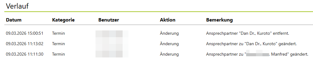 Die Änderungen und Löschungen von Ansprechpartnern werden im Verlauf protokolliert Diese Erweiterung sorgt für mehr Transparenz und Kontrolle bei der Terminpflege.