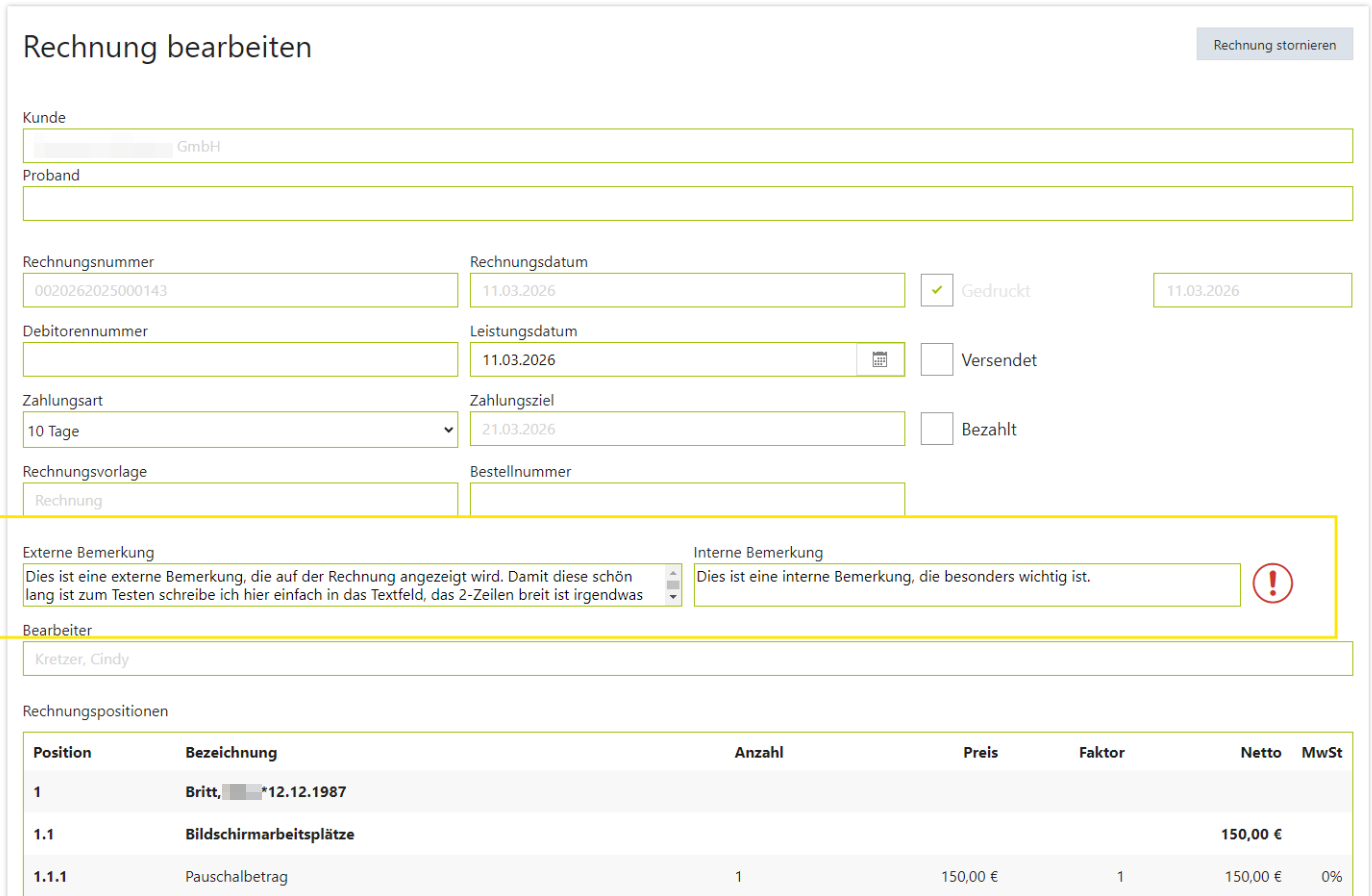 Mit diesem Release wurde die Rechnungsmaske um zwei neue Bemerkungsfelder erweitert, um die Kommunikation und interne Nachvollziehbarkeit zu verbessern.